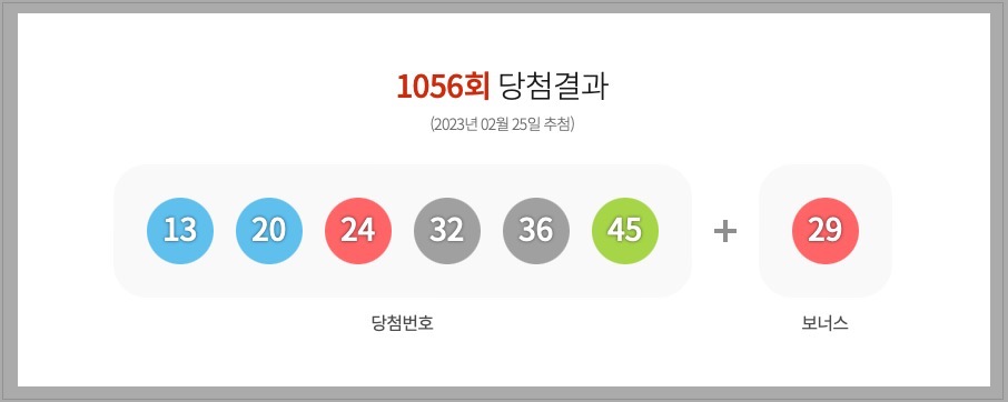 동행복권 로또 6/45 1056회(23년 2월 25일) 당첨번호는 13, 20, 24, 32, 36, 45, 보너스 29 번이 당첨되었습니다. 10의 자리 1개와 20번대 1개, 30번대 2개, 40번대 1개가 당첨되었네요. 이번에는 한자리수 번대 당첨 번호가 없었습니다.