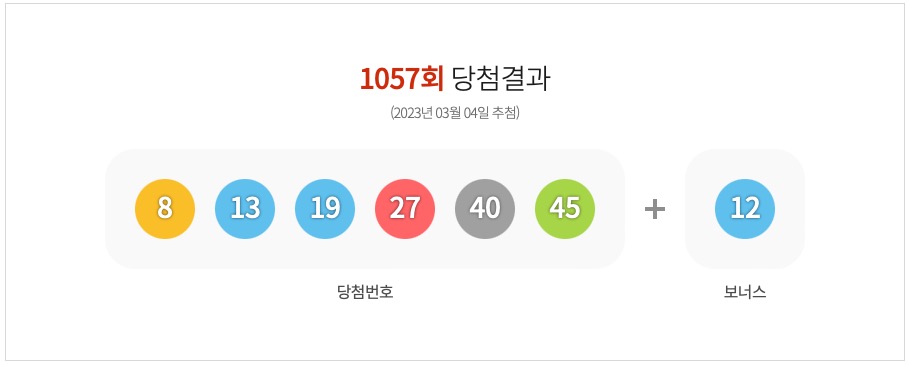 동행복권 로또 6/45 1057회(23년 3월 4일) 당첨번호는 8, 13, 19, 27, 40, 45, 보너스 12 번이 당첨되었습니다. 1의 자리수 1개와 10번대 2개와 20번대 1개, 40번대 2개가 당첨되었네요. 이번에는 30번대 당첨 번호가 없었습니다.