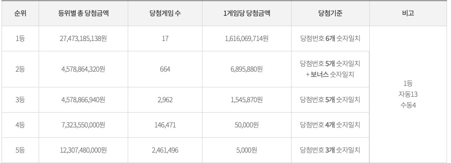 1등의 경우 자동 13게임, 수동 4게임 비율로 당첨이 되었습니다. 자동이 압도적으로 많은 수치의 결과를 확인하실 수 있네요.