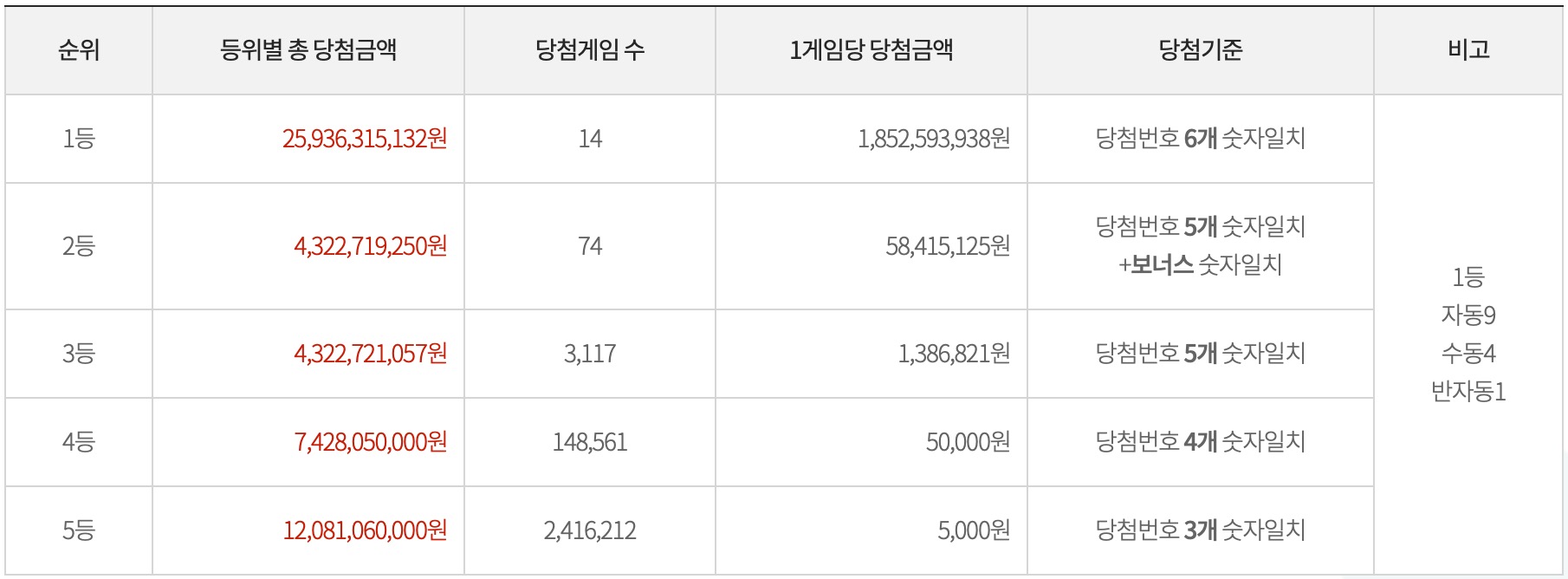 1등의 경우 자동 9게임, 수동 4게임, 반자동 1게임으로 자동이 두배 넘는 당첨의 결과를 얻었네요. 평균적인 당첨 게임수의 결과를 확인할 수 있습니다.