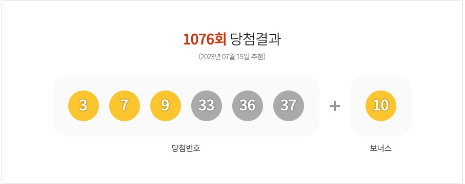 동행복권 로또 6/45 1076회(23년 7월 15일) 당첨번호는 3, 7, 9, 33, 36, 37 보너스 10 번이 당첨되었습니다. 1의 자리 번호대 3개, 10번대 0개, 20번대 0개, 30번대 3개, 40번대 0개가 당첨되었네요. 몇 개 번호대에 집중되어 당첨된 것을 확인하실 수 있습니다.