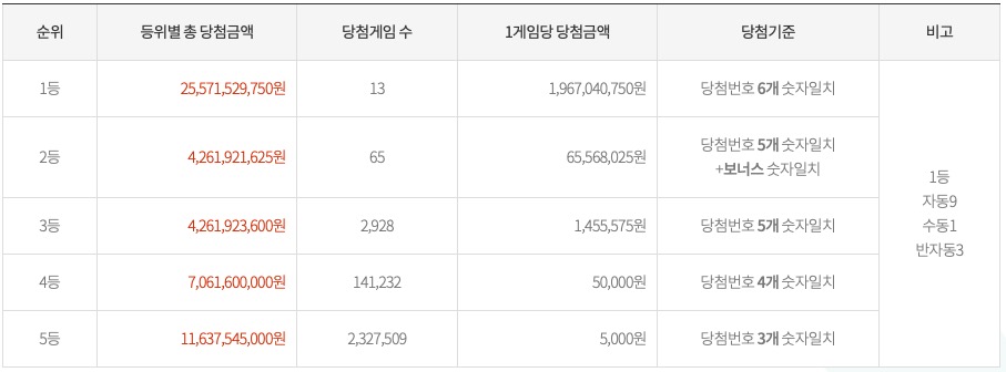 1등의 경우 자동 9 게임, 수동 1 게임, 반자동 3게임으로 자동 우위의 당첨 결과를 얻었네요. 평소보다 적은 1등 당첨 게임수의 결과를 확인할 수 있습니다.