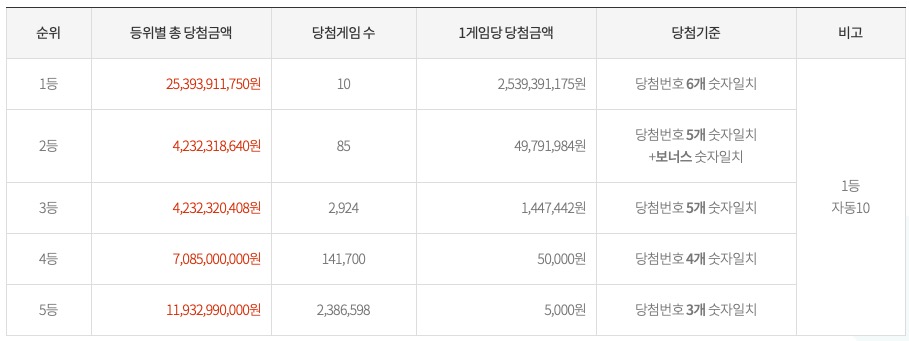 이번 당첨 번호로 1등 10 게임이 당첨되어 세전 약 25.3억원의 당첨금을 받으실 수 있겠습니다. 2등의 경우 85 게임이 당첨되어 세전 약 4,979 만원 수준의 당첨금을 수령하실 수 있겠습니다. 3등의 경우 2,924 게임이 당첨되어서 세전 약 144 만원 정도의 당첨금을 수령하시게 되었습니다. 이번 회차에서는 많은 당첨 수가 나온 것을 확인하실 수 있습니다.