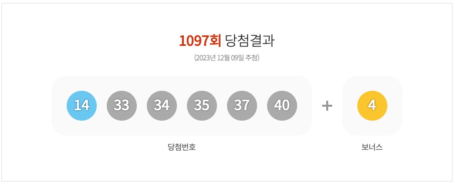 동행복권 로또 6/45 1097회(23년 12월 09일) 당첨번호는 14, 33, 34, 35, 37, 40 보너스 4 번이 당첨되었습니다. 1의 자리 번호대 0개, 10번대 1개, 20번대 0개, 30번대 3개, 40번대 1개가 당첨되었네요. 좁은 영역에서 번호가 당첨된 것을 확인하실 수 있습니다.