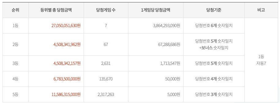 이번 당첨 번호로 1등 7 게임이 당첨되어 세전 약 38.3억원의 당첨금을 받으실 수 있겠습니다. 2등의 경우 67 게임이 당첨되어 세전 약 6,728 만원 수준의 당첨금을 수령하실 수 있겠습니다. 3등의 경우 2,631 게임이 당첨되어서 세전 약 171 만원 정도의 당첨금을 수령하시게 되었습니다. 이번 회차에서는 많은 당첨 수가 나온 것을 확인하실 수 있습니다.