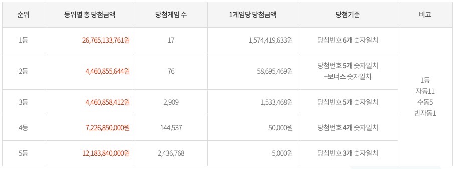 1등의 경우 자동 11 게임, 수동 5 게임, 반자동 1게임으로 자동 우위의 당첨 결과를 얻었네요. 평소와 비슷한 1등 당첨 게임수의 결과를 확인할 수 있습니다.