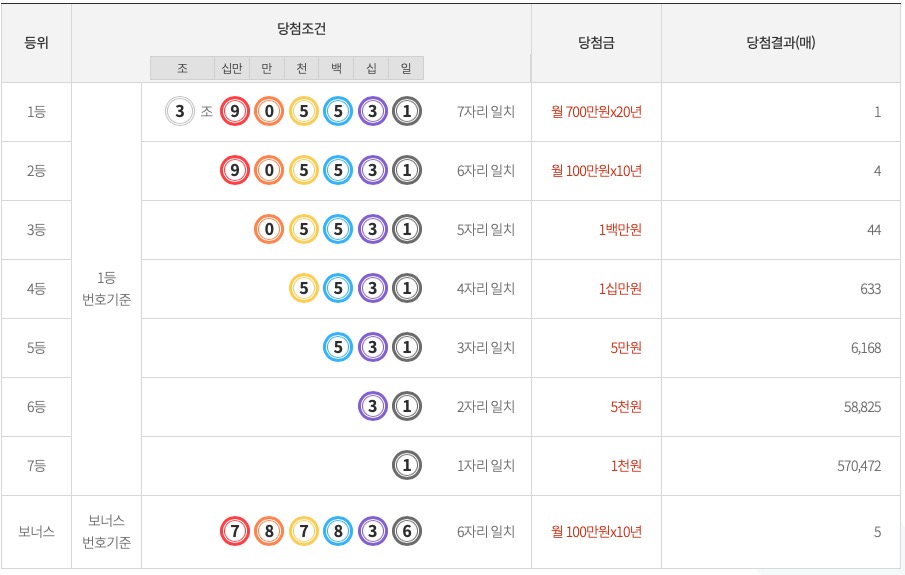 152회차 동행복권 연금복권 당첨번호 결과는 아래와 같습니다. 1등은 3조, 9/0/5/5/3/1 번호가 당첨되었으며 보너스 번호 각 조의 7/8/7/83/6 번호가 당첨되었습니다. 이번 차수에는 다양한 번호의 조합으로 나온 결과인 것 같습니다.