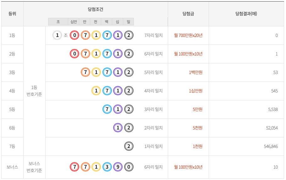 156회차 동행복권 연금복권 당첨번호 결과는 아래와 같습니다. 1등은 1조 0, 7, 1, 7, 1, 2가 당첨되었으며 보너스 번호는 각 조 7, 7, 1, 3, 9, 0 가 당첨되었습니다. 이번 차수에는 다양한 번호의 조합으로 나온 결과인 것 같습니다.