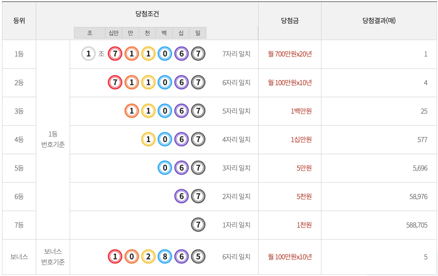 이번 회차에는 1등 당첨 매수 1매가 나왔습니다. 2등은 4매로 많은 당첨자가 나온 것을 확인하실 수 있네요. 3등의 경우 25매건이 당첨되었습니다. 이하 등수는 아래 표를 참고하시기 바랍니다.