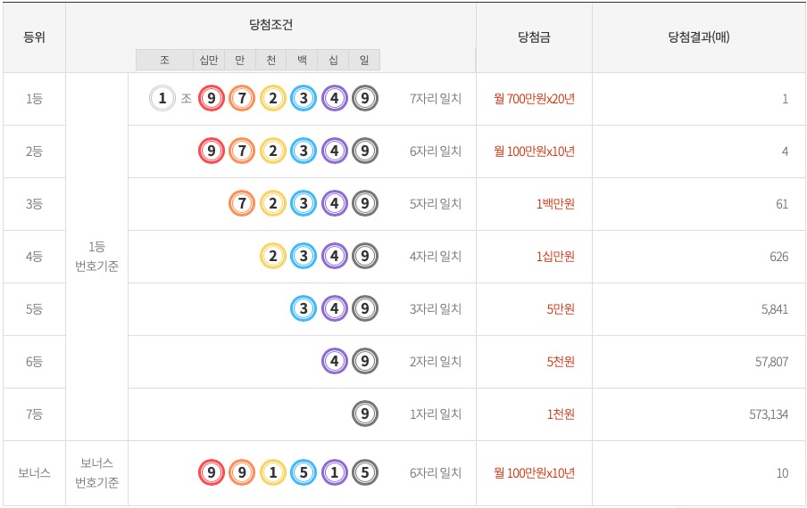 이번 회차에는 1등 당첨 매수 1매가 나왔습니다. 2등은 4매로 많은 당첨자가 나온 것을 확인하실 수 있네요. 3등의 경우 61매건이 당첨되었습니다. 이하 등수는 아래 표를 참고하시기 바랍니다.