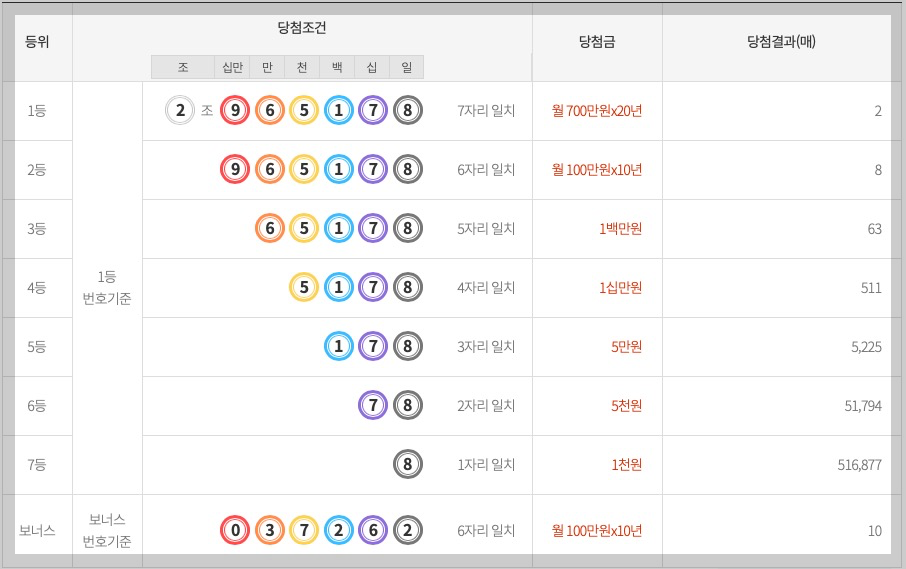 이번 회차에는 1등 당첨 매수 1매가 나왔습니다. 2등은 1매로 많은 당첨자가 나온 것을 확인하실 수 있네요. 3등의 경우 58매가 당첨되었습니다. 이하 등수는 아래 표를 참고하시기 바랍니다.