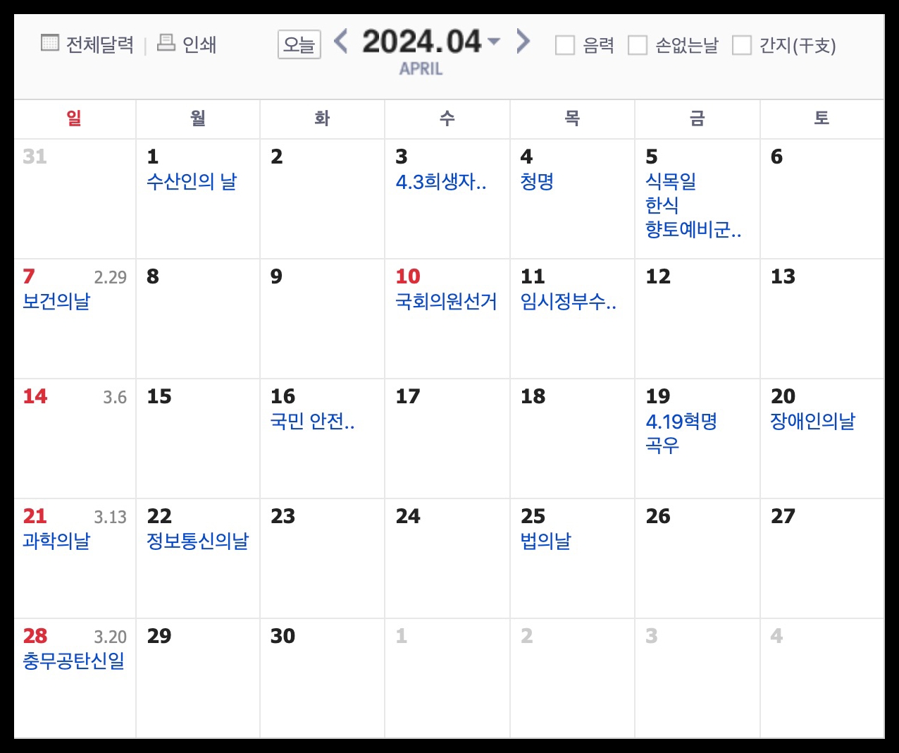 24년 2분기에도 월별 공휴일이 골고루 포진되어 있습니다. 올해에는 보통 휴일이 없는 4월에 국회의원선거일이 계획되어 있어서 마른 땅에 단비가 되어주네요!