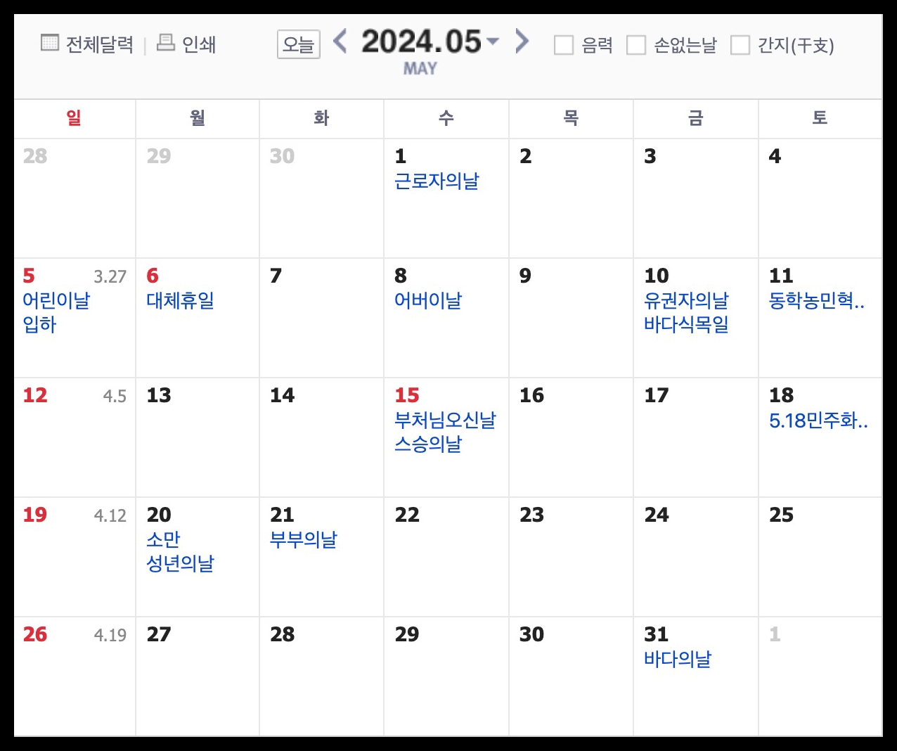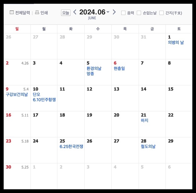 24년 2분기 공휴일 일정 (3월~6월)