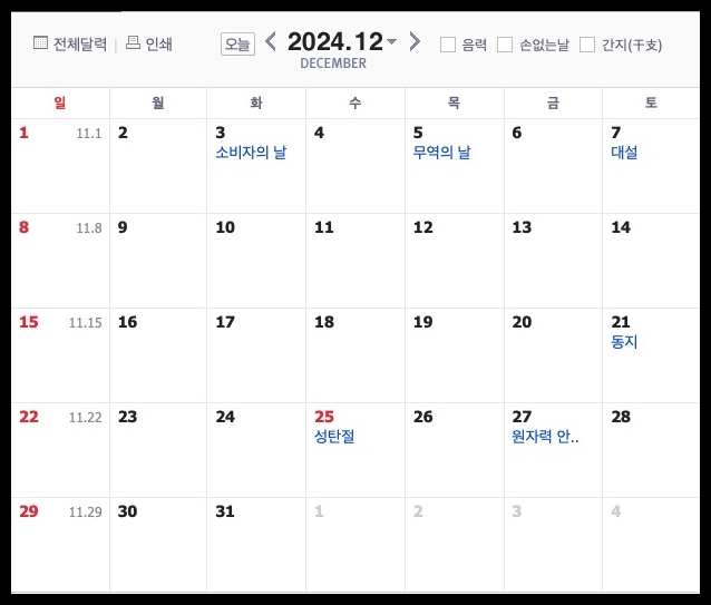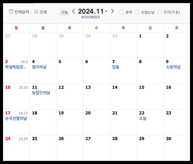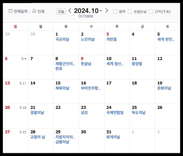 24년 4분기 공휴일 일정 (10월~12월)